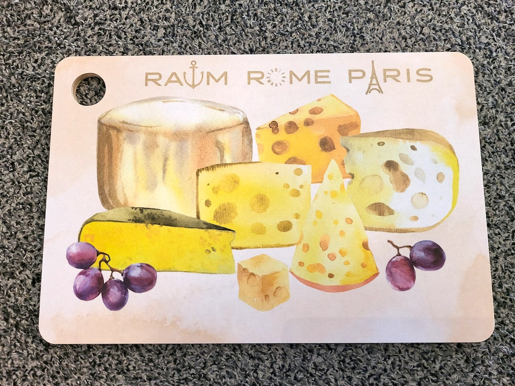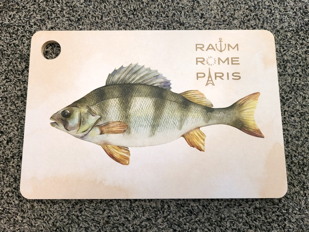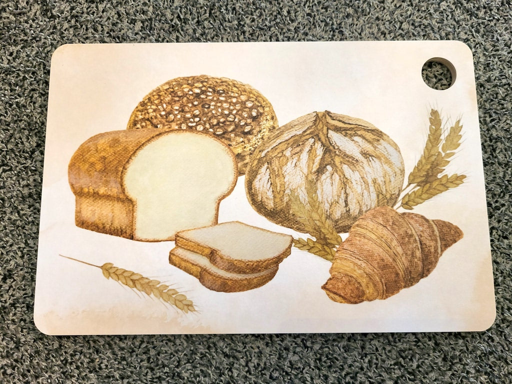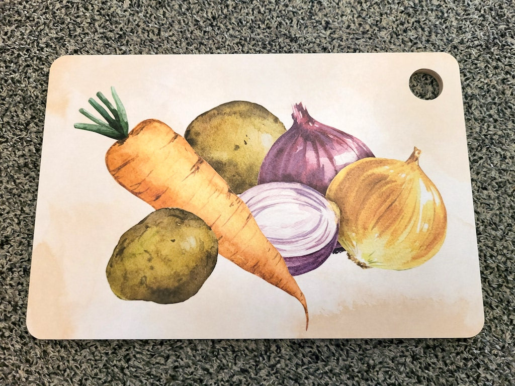 Käsityönä koivuviilusta valmistettu tyylikäs mattapintainen leikkuulauta, jossa on kaksipuolinen kuvitus: