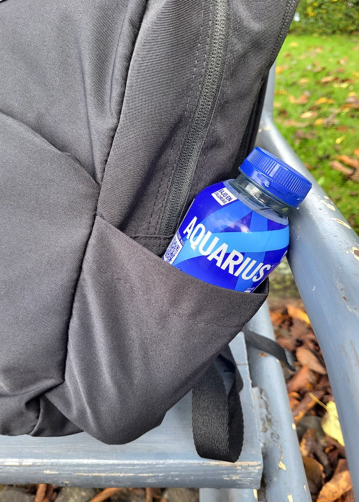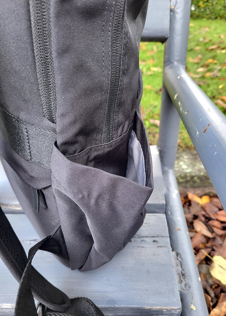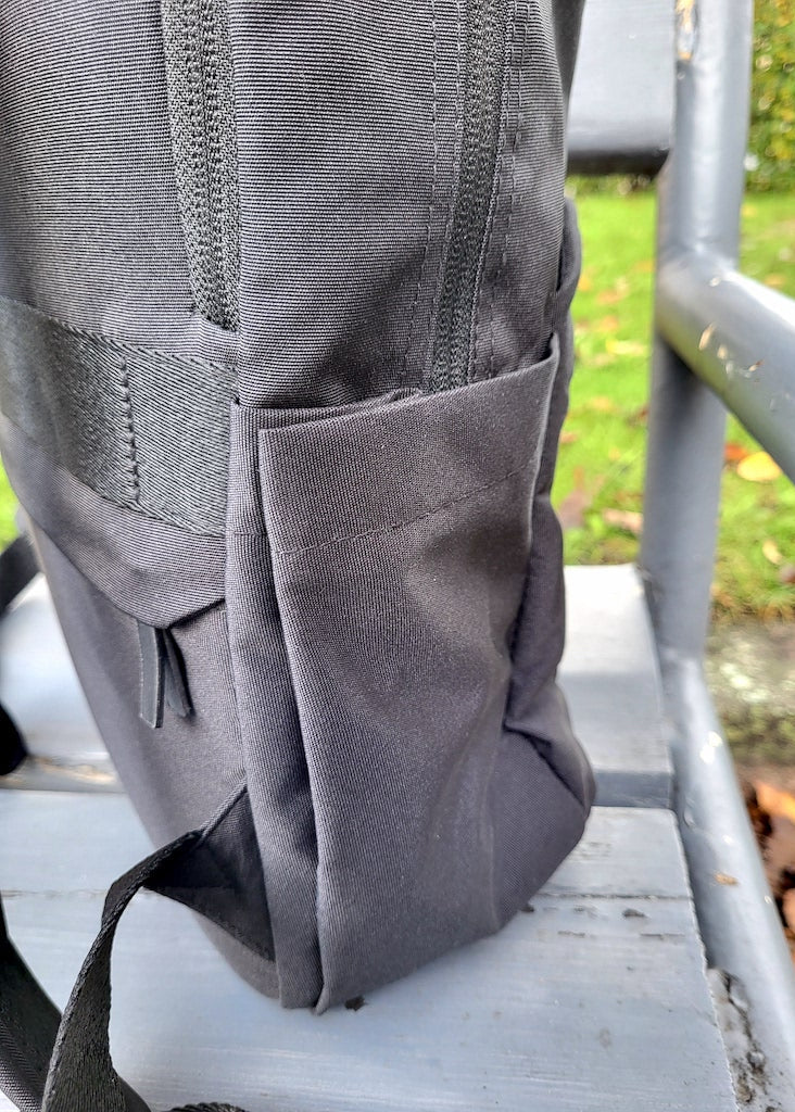 - Sivuilla magneetilla varustetut läppätaskut juomapullolle/sateenvarjolle